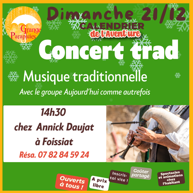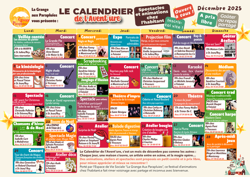 5 événements auront lieu en décembre à Foissiat, dans le cadre du calendrier de l'avent'ure organisé par La Grange Aux Parapluies (Espace de Vie Sociale).
